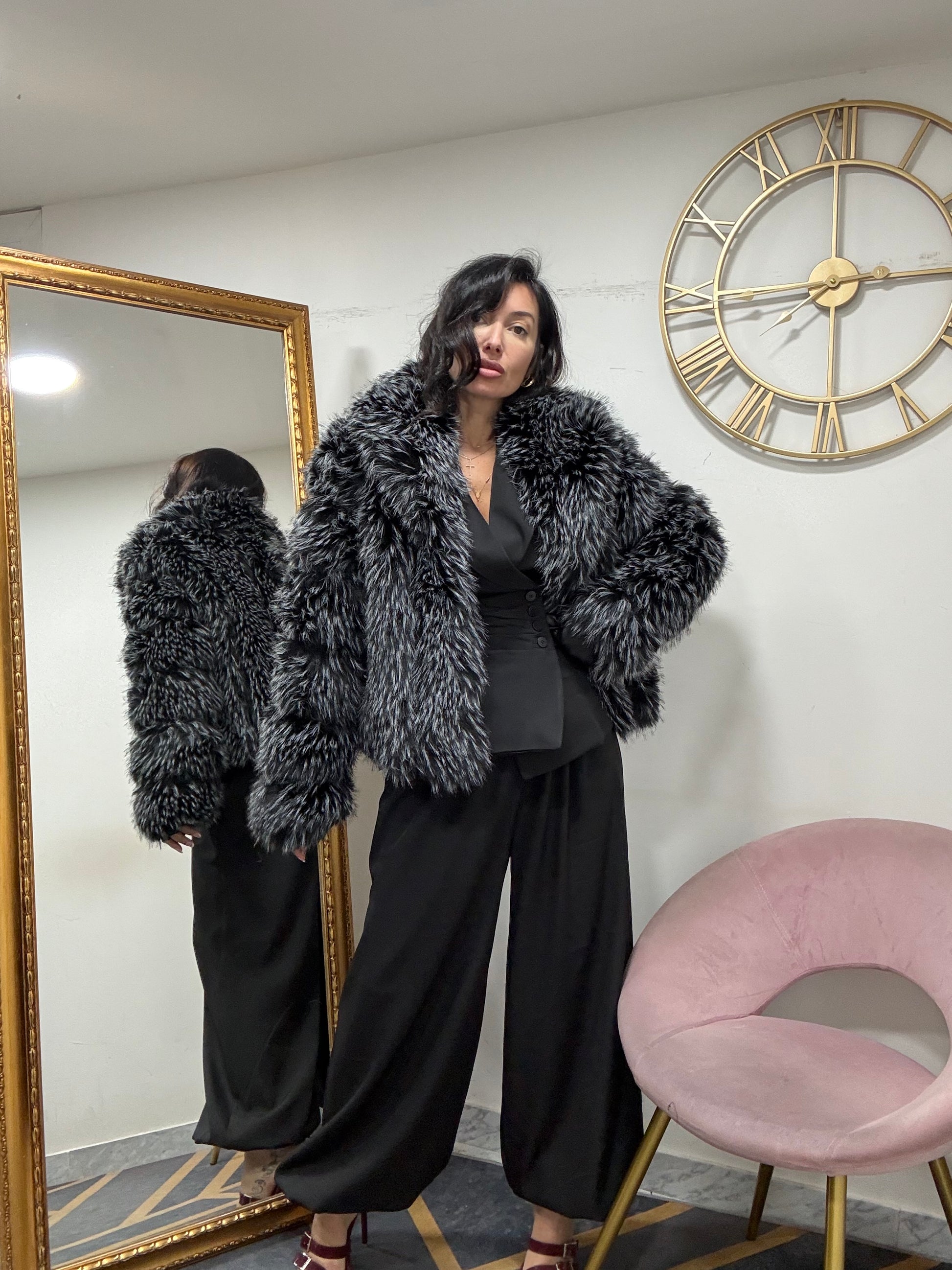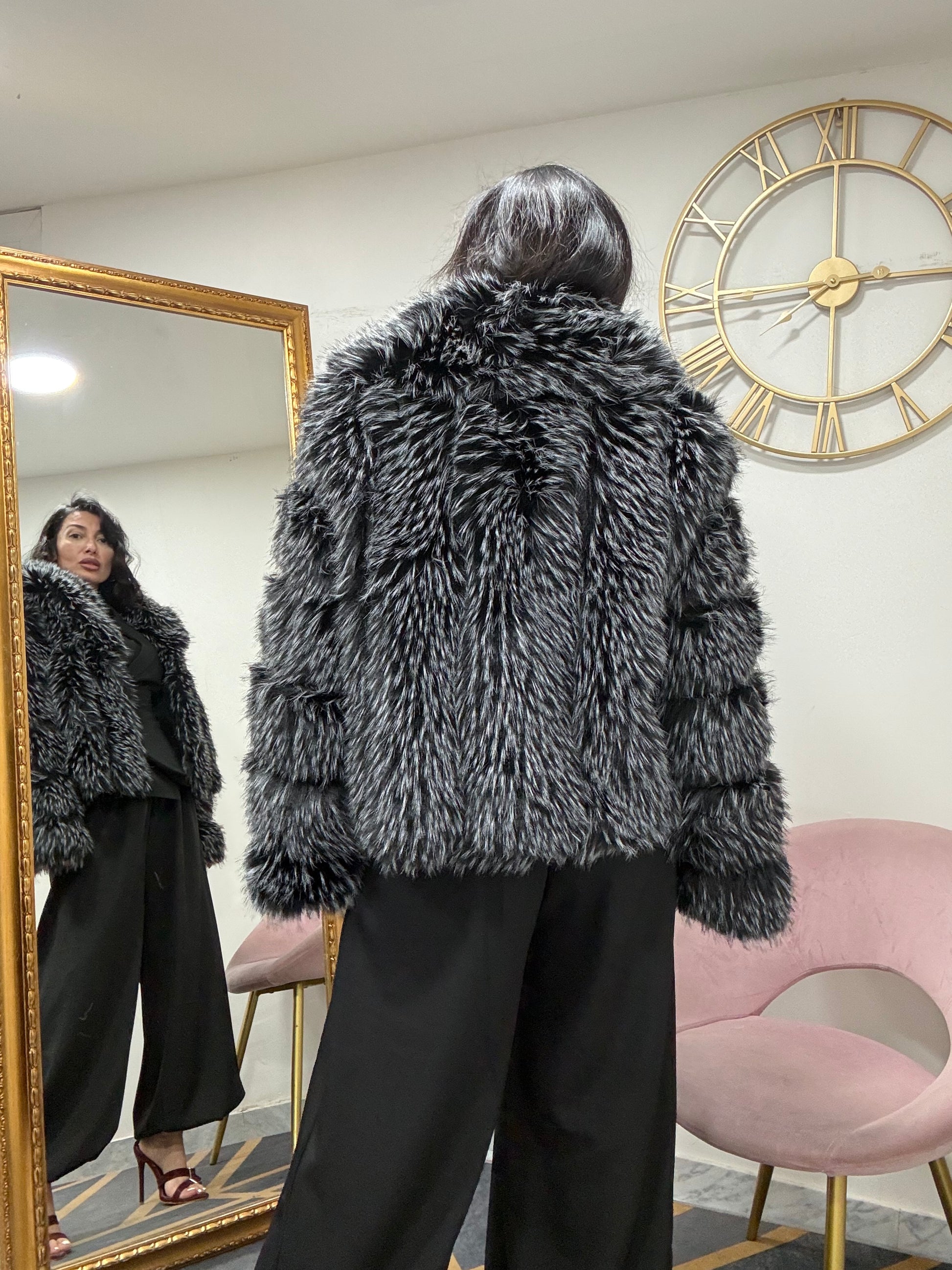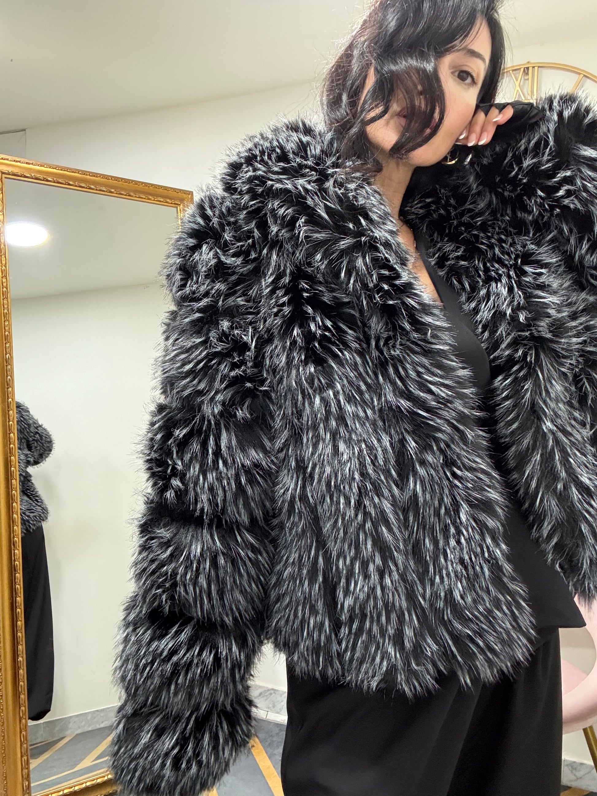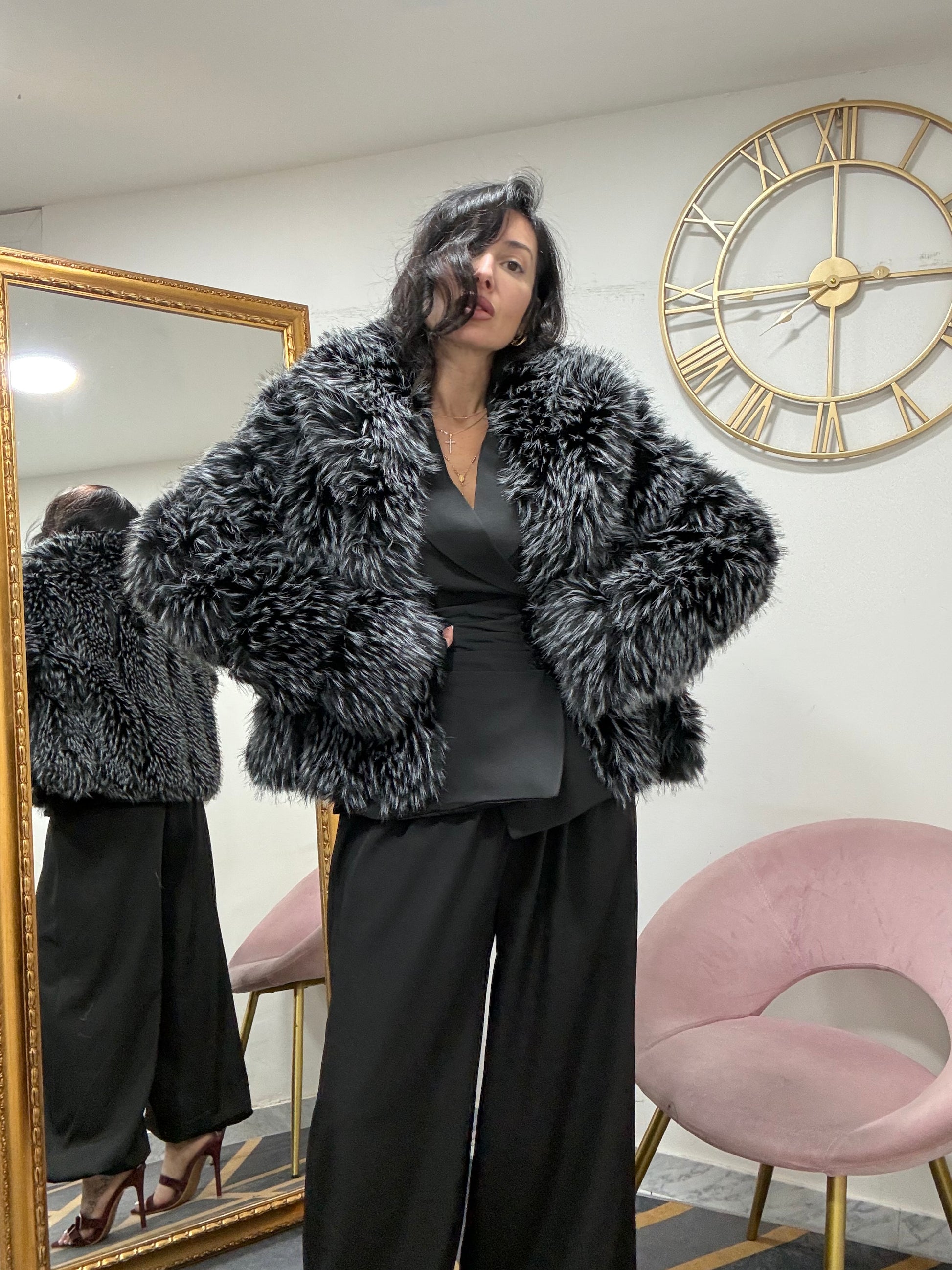 Ecofur con inserti in ecopelle , con collo scialle, con tasche e chiusura a gancio.