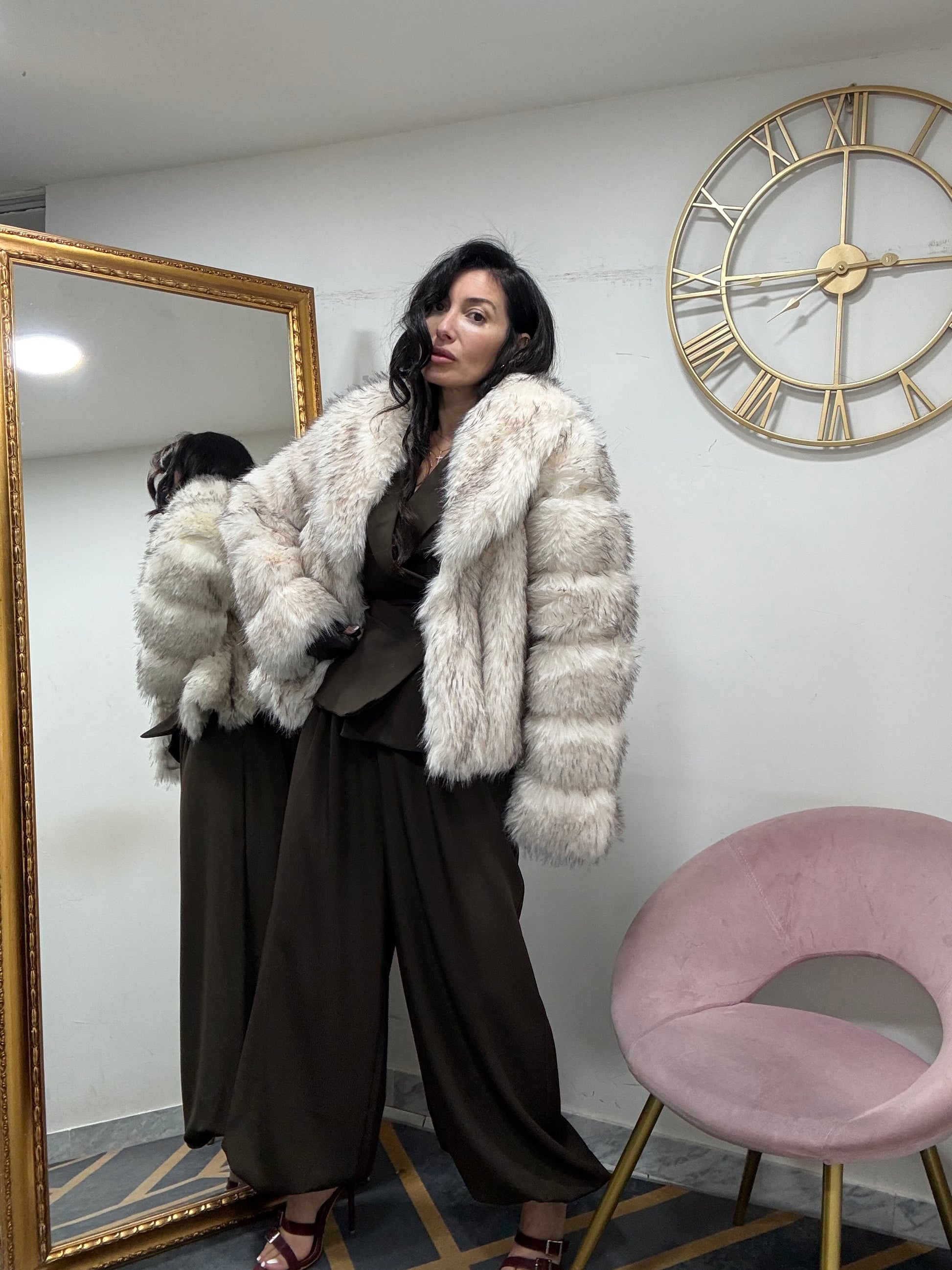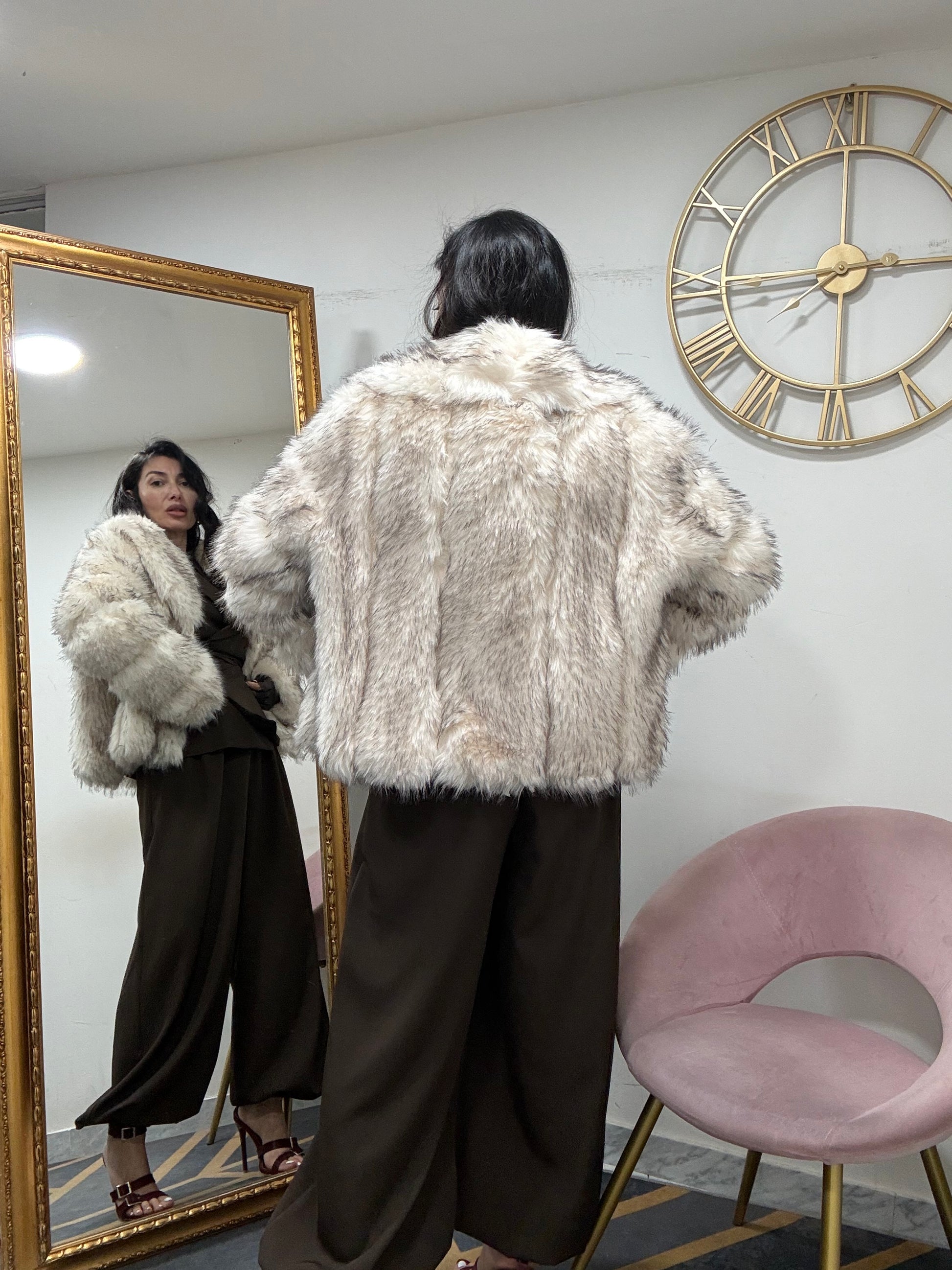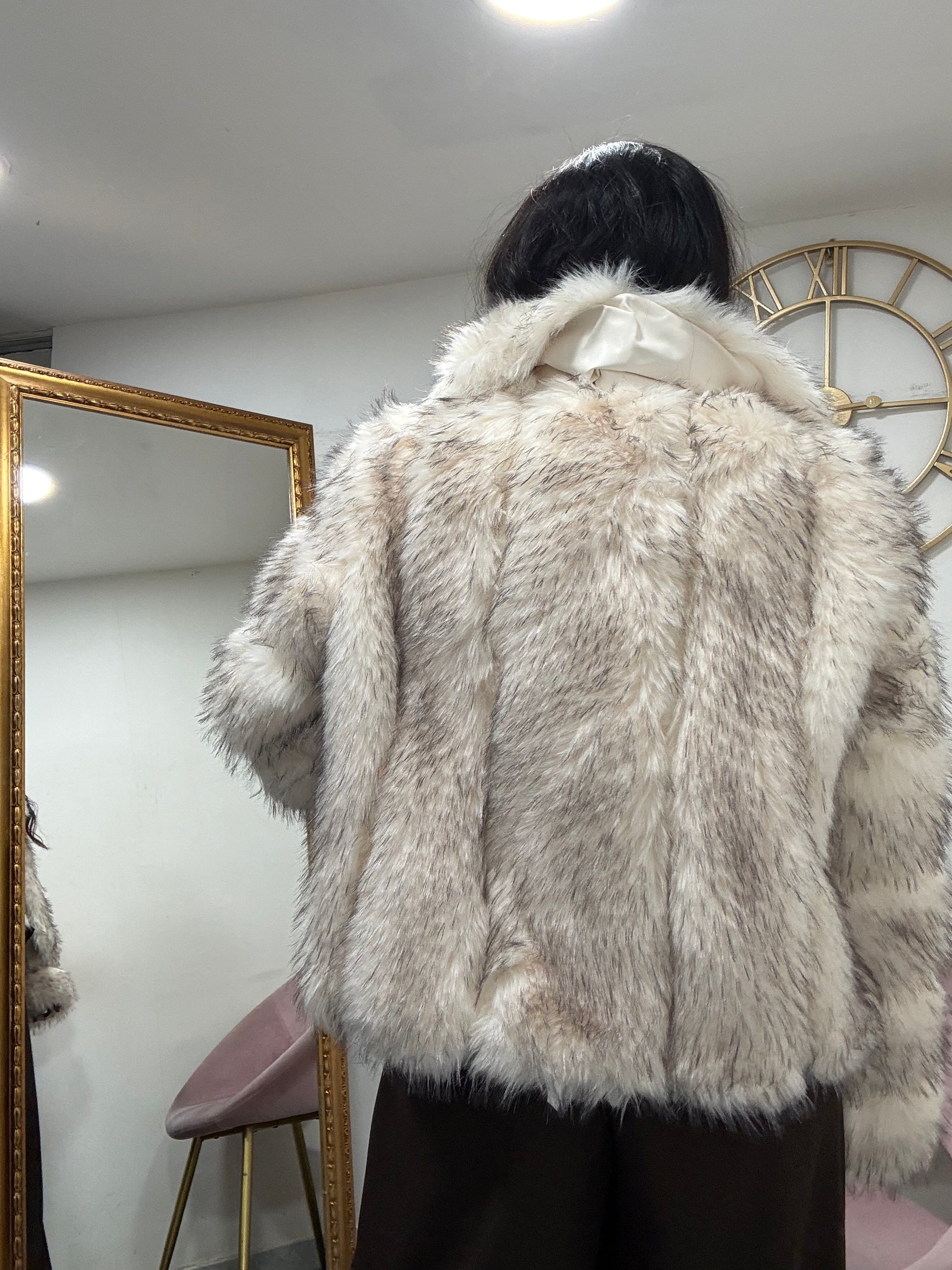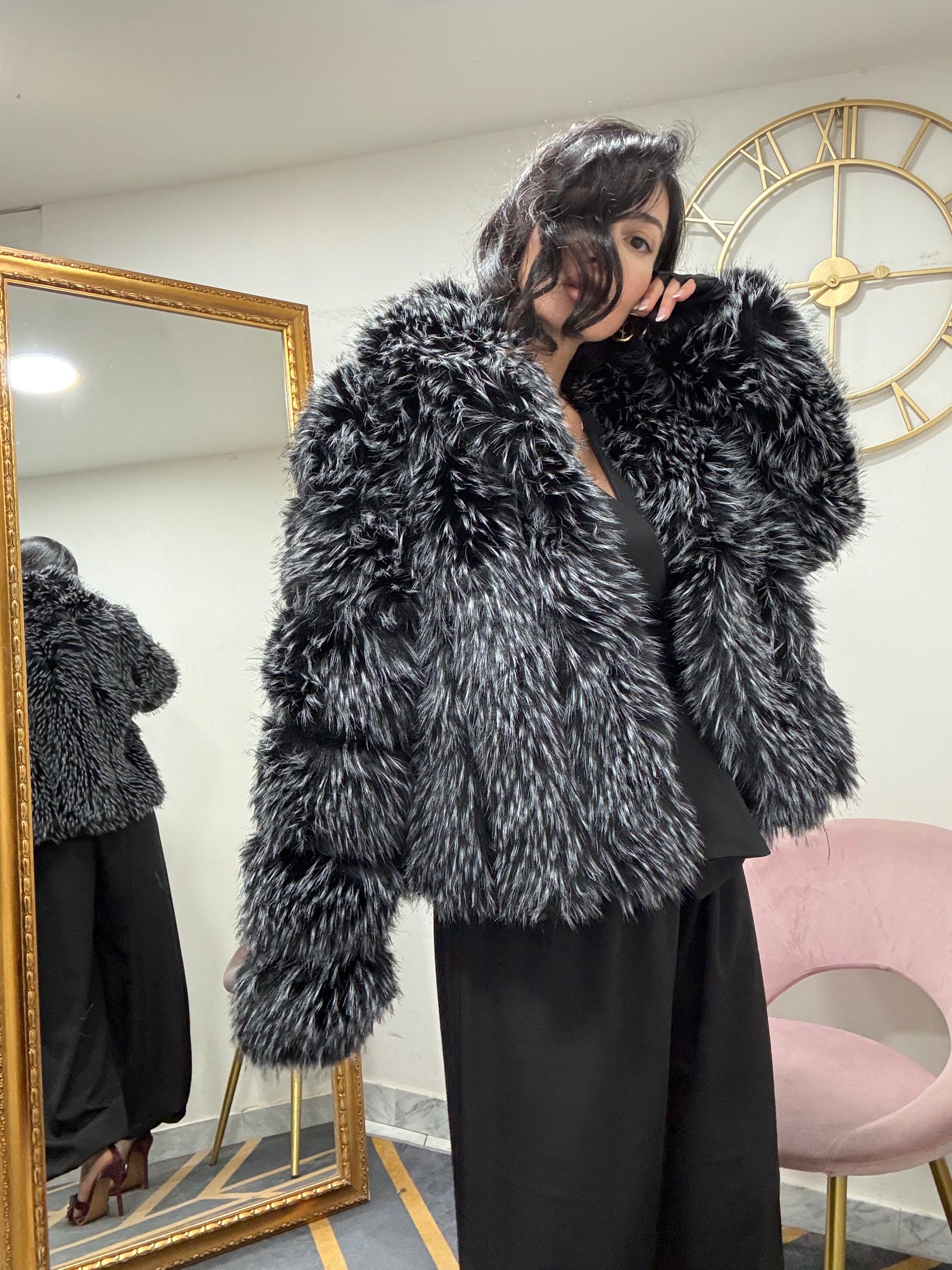 Ecofur con inserti in ecopelle , con collo scialle, con tasche e chiusura a gancio.