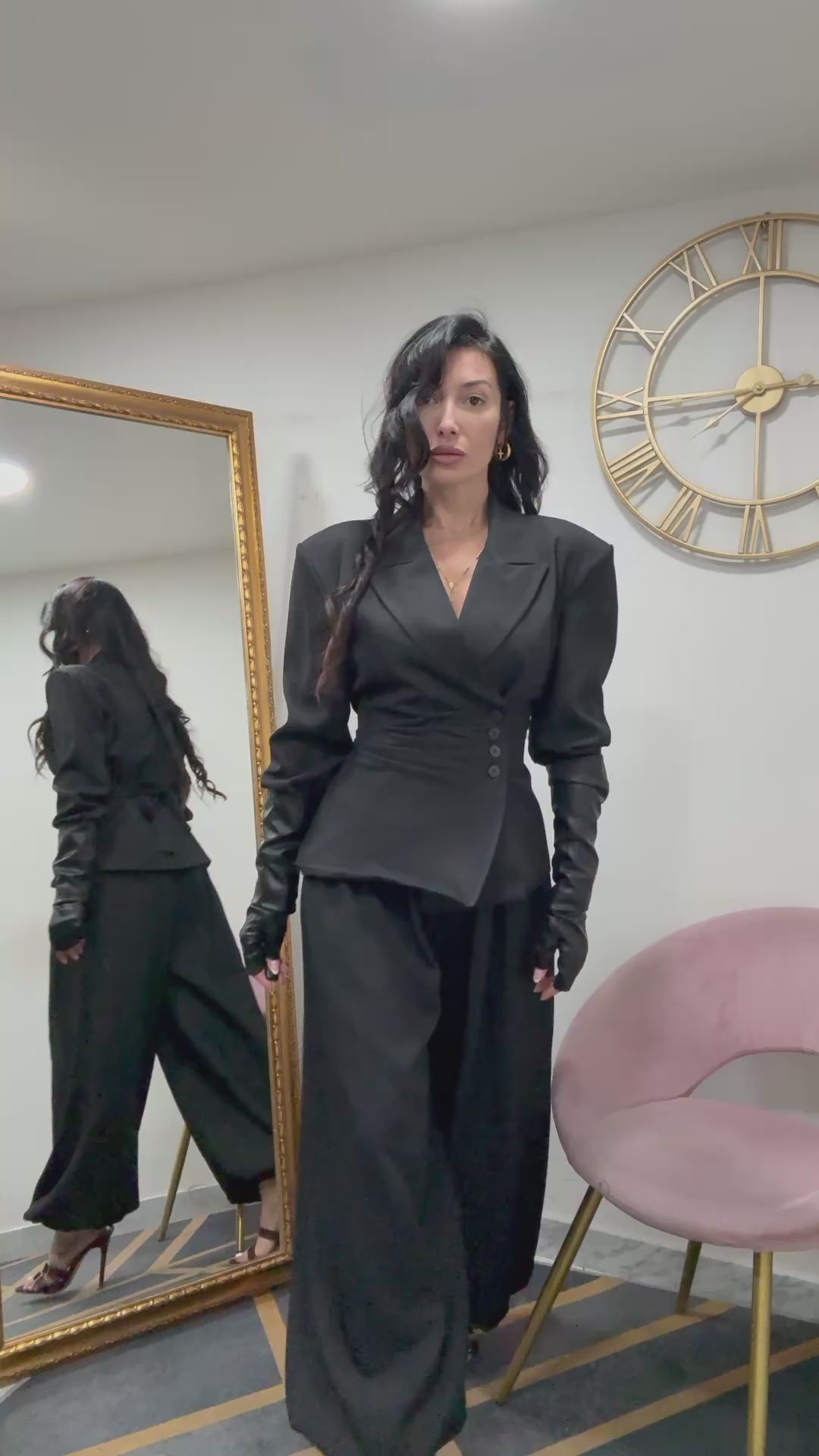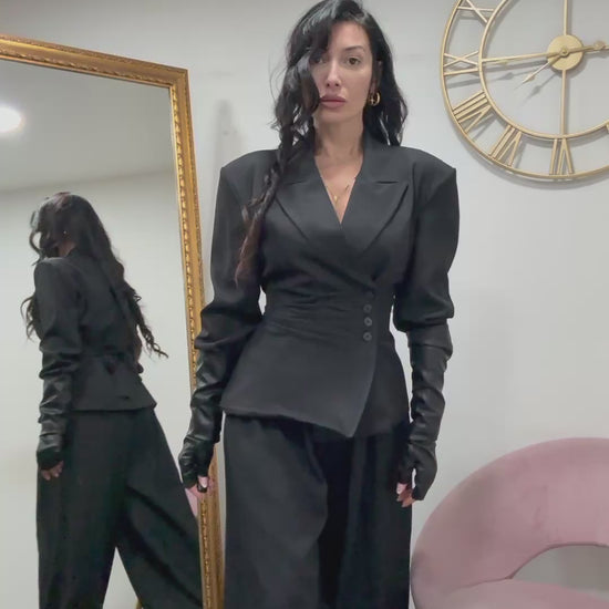 Tessuto classico fiacca con doppio petto e fascia regolabile sul retro. Pantalone con elastico in vita ed alla caviglia